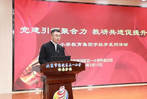 为深入贯彻高质量党建引领学校高质量发展的理念,2026年3月13日, 五一小学怀柔分校成功举办了以“党建引领聚合力,教研共进促提升”为主题的手拉手系列活动。参与此次活动的有五一小学教育集团党委书记彭欣、教学主任彭文晶、兄弟学校干部教师代表、及五一怀分全体领导干部、骨干及青年教师。活动由执行校长庞盛主持。