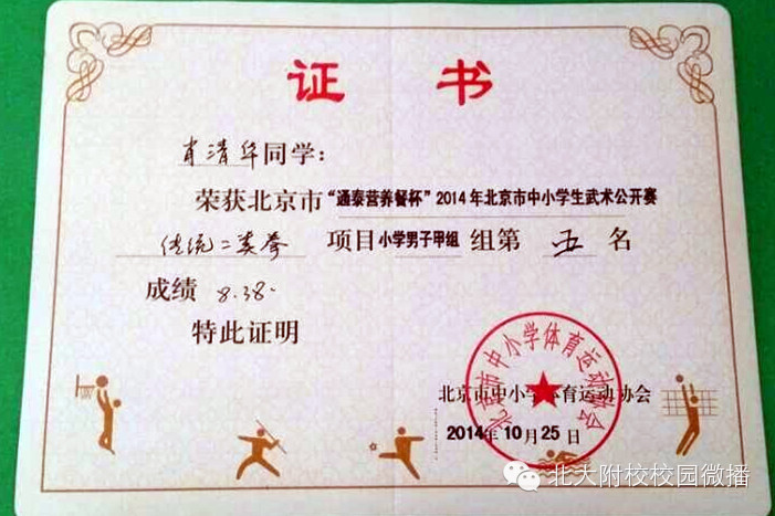 微讯(吴彩霞)2014年10月25日,我校小学生武术队在王东杨老师的带领下参加2014年“通泰营养餐杯”北京市中小学生武术公开赛,在北京市661名小学生参赛选手中,余丹廷同学荣获小学女子甲组传统四类拳第二名,王军坐同学荣获小学男子甲组传统二类拳第二名,李婧源同学荣获小学女子甲组少林拳第五名,肖清华荣获小学男子甲组传统二类拳第五名。