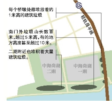 除此之外,小区一期东侧紧邻轻轨昌平线,在轻轨线的一个个桥墩下,还分别堆着约1米高的建筑垃圾。在中海尚湖二期附近,也有一座面积差不多的垃圾山。这些堆放的建筑垃圾距北沙河河岸和别墅居住区的距离均不到50米,而按照《城市卫生设施规划规范》中规定,垃圾卫生填埋堆积距居民点的距离必须大于500米。