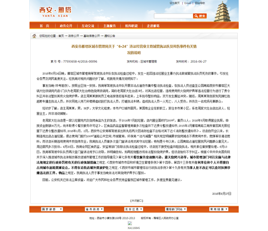 6月25日凌晨 02:07 分,西安市公安局雁塔分局在在官方微博上发布了“警讯”,内容为:“2016年6月24日21时30分许,雁塔区等驾坡城管执法中队,在依法取缔辖区公园南路一餐饮商户违法占道经营的执法过程中,一名执法队员重伤送医抢救后不治身亡。目前,雁塔警方已将主要嫌疑人控制,该案正在全力侦办中。”