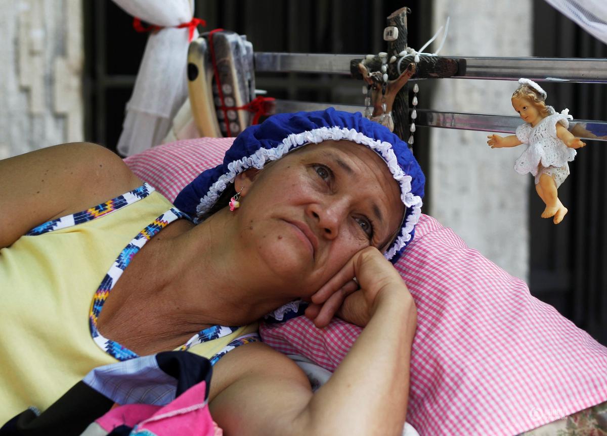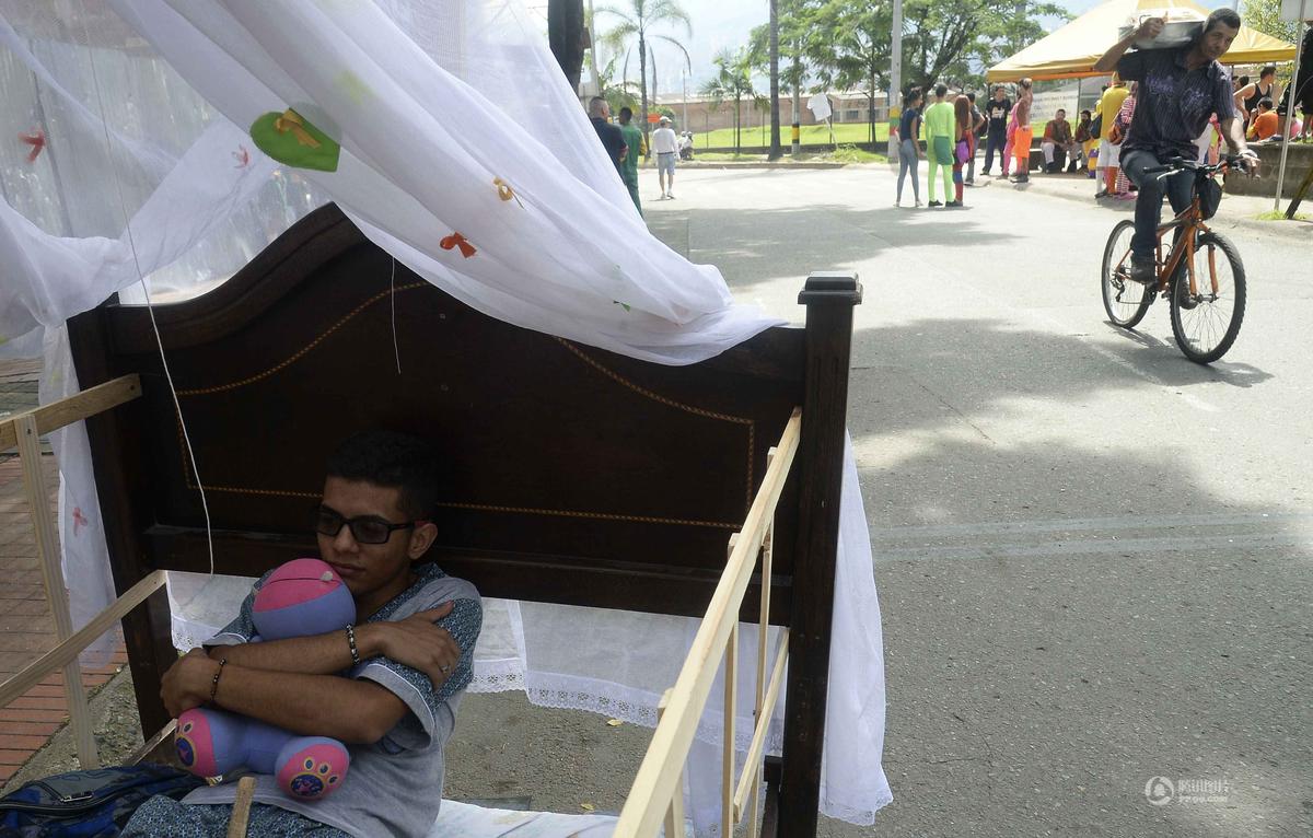 当地时间2016年8月14日,哥伦比亚安蒂奥基亚省伊塔圭,民众将床抬到街头,懒洋洋躺在床上,庆祝懒人节。