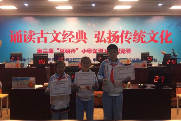 中国教育品牌网讯 中华优秀传统文化是中华民族的瑰宝,滋润着一代又一代的中华儿女。为让学生积淀丰厚的国学底蕴,培养中华少年,北京小学通州分校一直致力于弘扬中华传统文化,积极参与各种形式的活动,激发学生学习国学经典的兴趣。就在这次“诵读古文经典,弘扬中华文化”京萌杯比赛中,该校积极准备。赛前,老师们精心准备比赛试题,每一位北分少年积极参与古文经典的学习, “京萌杯”的选拔比赛也是人人参与。 经过激烈的选拔比赛,四年级黄曦峤、五年级于静涵、六年级宋士奇脱颖而出,代表该校参赛。