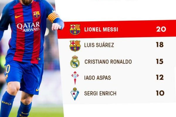 梅西本赛季已经在西甲赛场取得20粒进球,不仅领跑西甲射手榜,还位列欧洲金靴奖即时榜单的首位。梅西已经连续9个赛季联赛进球数达到20。此外,本场比赛对于梅西还有特殊的意义,这是他代表巴萨取得的第400场胜利。