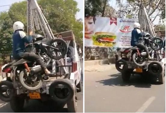 球网综合报道]据英国《每日邮报》3月9日报道,印度北部坎普尔市的30岁男子默罕默德•诺曼(Mohammad Norman)因为违法停车被处以300卢比(约合人民币25元)的罚款。他拒绝支付罚款并在市政部门即将拖走他的摩托车时跳上了车,最后连人带车一并被拖走。