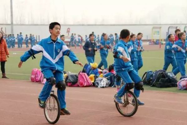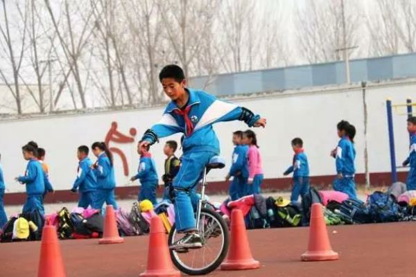 下午,走进怀柔庙城学校,看到学校的师生在操场上运动,而运动场上骑着独轮车的学生,吸引了视线。