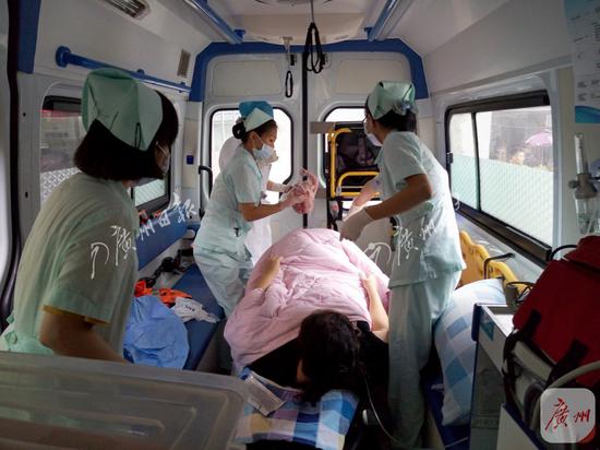 麦女士的家离白云区第二人民医院很近,车程约十分钟,救护车的空间不大,车上有叶发卓医生,谢丽红、邝淑芬两位急诊护士,麦女士以及其丈夫,还有一名即将诞生的宝宝。疼痛中的麦女士不断发出痛苦的呻吟声,全车的人均十分紧张焦急,临危受命第一次负责接产的叶发卓满头是汗,时刻盯紧婴儿出来的情况,精神高度集中。