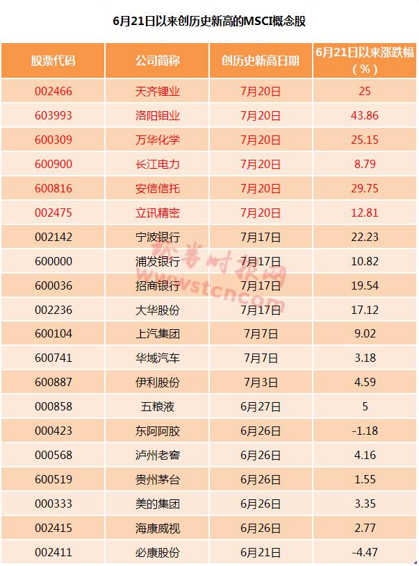 6月21日凌晨,明晟公司宣布将A股纳入MSCI新兴市场指数。今天A股入MSCI正式满月, Wind统计数据显示,6月21日以来,222只MSCI概念股中,有159只上涨,占比71.62%,20股创出历史新高,更有6股于今日创出历史新高。