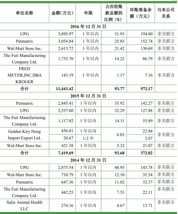 2016 年末,公司应收账款余额前五名客户分别为:UPG、Petmatrix、Wal-MartStore Inc.、The Fair Manufacturing Company Ltd.和 FRED MEYER,INC.DBAKROGER。2013-2016年,公司各期末前五名客户应收账款合计分别为3,424.97万元、4,950.11万元、7,419.69万元、11,443.42万元,其占应收账款总额的比例分别为68.58%、84.27%、93.68%、93.77%。
