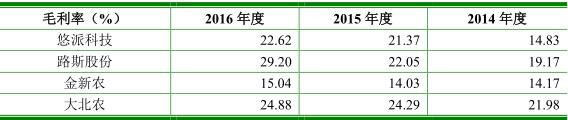 公司称,2014 年度至 2016 年度,公司毛利率高于同行业可比公司平均值,主要是由于目前尚无与发行人从事完全同类产品的公司,选择的可比公司在产品种类、客户群体、销售市场等方面均与发行人有所不同。大北农(6.080, -0.06, -0.98%)、金新农(10.350, -0.41,-3.81%)的主要产品为猪饲料,而公司产品系宠物食品范畴内的宠物零食,且主要外销至美国、加拿大及欧盟国家,产品品质的要求相对更高,并且在研发环节需要针对宠物在口味方面可能存在的各种需求,调节其产品的适口性、口味、耐咬性,并附加除口臭、增强免疫力等功能,技术含量及产品附加值相对较高,其毛利率也相应较高。