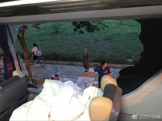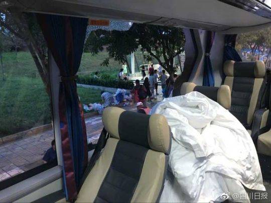 夜幕将至,这是九寨旅游团队返回成都动物园集散地的第16辆大巴。这辆大巴的后车窗被落石砸中,整块玻璃碎成一地,当时坐在这个窗边的是一对来自浙江的小情侣,女孩名叫曾雅静,是位老师,她和男朋友黄伟(化名)趁暑假来九寨沟玩。刚到九寨沟的第一天就发生了地震。“地震发生后,我们坐大巴往酒店赶,突然间有块飞石砸进了后车窗,我就感觉突然被他抱住了,睁开眼睛才发现玻璃在脚下碎了一地,脚边还有块四个拳头那么大的石头”曾雅静激动的对记者说。当时车上一共29人,后车窗被碎石砸破后,导游和司机让大家到大巴的另一侧躲避,并用棉被塞住破损的玻璃,避免碎玻璃伤人。8月9日晚20点30分,全车人都安全回到成都。