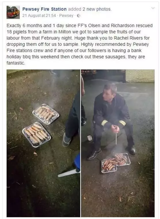 中新网8月23日电 据外媒报道,今年2月,英国威尔特郡一个农场发生火灾,农场内2头母猪、18头小猪仔被消防员救出。不过,侥幸逃生的小猪们完全没有料到自己的命运——它们半年后被主人做成香肠,送给了当时救援的消防员以示感谢。