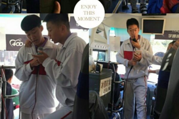 同学们打开手机的手电筒功能为演唱者助威!车厢里的气氛热烈,欢快,充满欢声笑语,一扫同学们的旅途疲惫