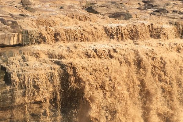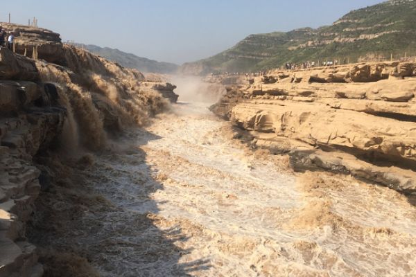走进壶口瀑布,直至护栏边缘,便有一番全新感觉。只见一条黄龙从二三十米处笔直地插向石槽底部,激荡而起的水雾夹杂着万马奔腾般的响声从谷底阵阵袭来,虽然相隔甚远,却也被这铺天盖地的黄烟与雷鸣迫得张不开嘴,甚至呼吸困难。人,在如此惊心动魄的大自然的力量中显得如此渺小与微不足道!黄河的壮美,实在是令人震惊!