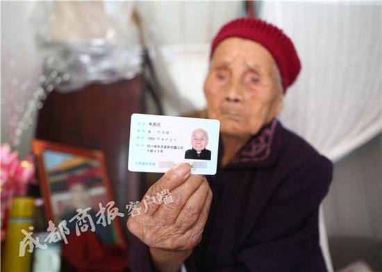 朱郑氏戴着一顶毛绒帽子,穿着一件紫色薄外套,脸上虽然布满皱纹,气色还是不错,爱整洁,就连她的身份证也和社保卡叠放在一起,整整齐齐。“你们哪里找得到哦,我搁的。”儿媳妇要去找身份证,老人家起身,扶着助行器,颤颤巍巍走向房间,从一个清代的布袋子里,拿出一叠证件。