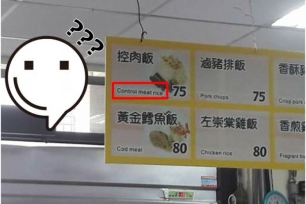 海外网9月24日电 网络上经常能看到因乱用翻译软件,而闹出各种译名笑话。近日,网传一张台湾交通大学食堂照片,照片中非常肥美诱人的“控肉饭”,竟然被翻译成“control meat rice”,令一众网民笑言:“这是直译,不算错啊”。