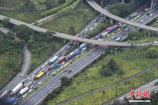 广河高速腊圃至八斗路段大批车辆缓慢行驶。 中新社记者 陈骥旻摄