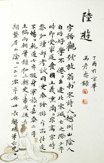 陆游一生笔耕不辍,诗词文俱有很高成就,其诗语言平易晓畅、章法整饬谨严,兼具李白的雄奇奔放与杜甫的沉郁悲凉,尤以饱含爱国热情对后世影响深远。陆游亦有史才,他的《南唐书》,“简核有法”,史评色彩鲜明,具有很高的史料价值。