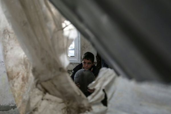 图为2017年12月13日,加沙地带南部的一名巴勒斯坦儿童正从被以色列空袭损毁的家中收拾物品。