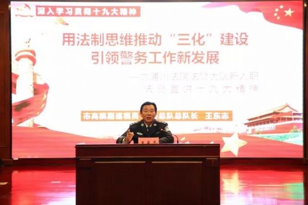 随后,王东志总队长从深刻认识学习贯彻党的十九大精神的重大意义、全面准确学习领会党的十九大精神的深刻内涵、以习近平新时代中国特色社会主义思想为指引推动司法警务工作三个方面,深刻阐明了十九大精神的核心要义,并要求全体司法警察牢固树立“四个意识”,坚决听从党的领导;牢记职责使命,捍卫司法尊严和审判权威;苦练业务技能,积极保障执法办案,为法治社会和首善之都建设贡献力量。