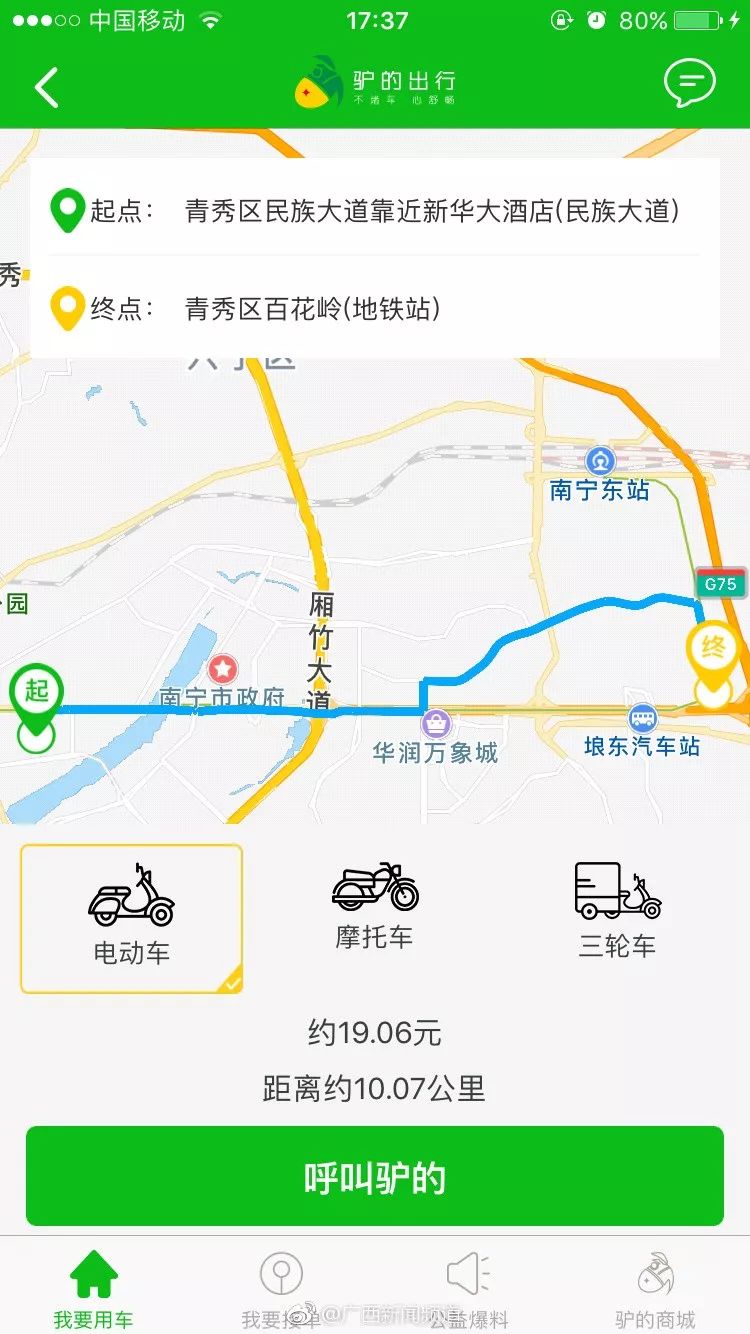 ▲图片来源:南国早报这个APP的使用方法是跟网约汽车是差不多的,输入起点和终点以后,它就会根据距离计算出价钱来,并且有三个选择,一个是电动车、摩托车还有三轮车,比如现在的距离是10公里,价格就约为19元。