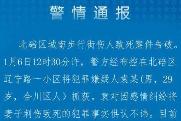 1月6日,重庆市公安局北碚区分局通过其官方微博发布消息称,发生于北碚城区南步行街伤人致死案告破。1月6日12时30分许,警方经布控在北碚区辽宁路一小区将犯罪嫌疑人袁某(男,29岁,合川区人)抓获。袁对因感情纠纷将妻子刺伤致死的犯罪事实供认不讳。目前,袁某已被警方刑事拘留,案件正进一步侦办中。