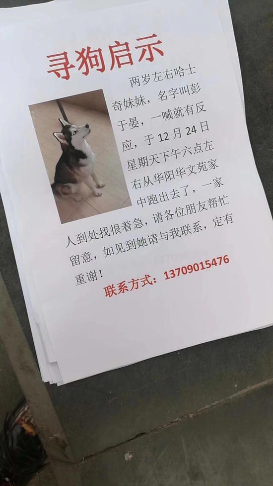今日上午,一张《寻狗启示(应为“启事”)》在网上流传,启事上说明:一只2岁左右哈士奇妹妹,名字叫彭于晏,在12月24日星期天下午6点左右,从华阳华文苑家中跑出去了,现在家人很着急。