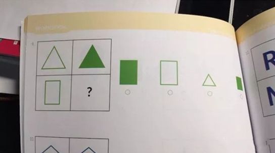 比如下面这道题,第一行是白色到绿色的一个规律,于是第二行将这个规律套用就能得到答案。这就是一次类比。
