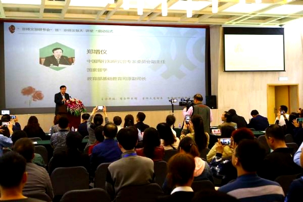 中国陶行知研究会专家委员会副主任、国家督学、教育部基础教育司原副司长郑增仪作为嘉宾代表发言。他从国家政策的层面肯定了读书会的意义,为全民读书项目的活动提出了高屋建瓴的建议。他谈道,推广全民阅读是一件意义深远的事业,我们是一个具有灿烂文化和悠长历史的国度,应该通过阅读将文化和历史继续传承下去。他还指出我国目前年人均阅读量远远低于世界其他国家,这和我们文化古国以及大国复兴的中国梦是不相符的。