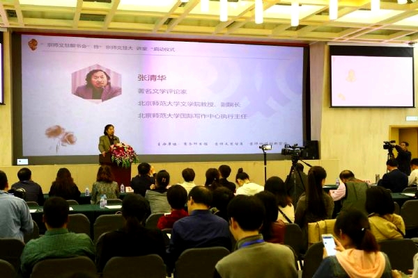 著名文学评论家、北京师范大学文学院教授、副院长、北京师范大学国际写作中心执行主任张清华教授也为启动仪式做了深刻发言。张教授语言幽默、逻辑清晰,结合具体案例阐述了读书对个人乃至社会的意义,并结合自己的经历对中学生和成人如何读书做了精彩分享。