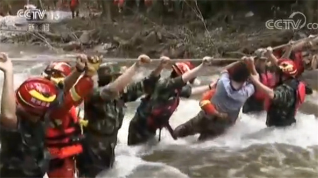 救援小组由300多名武警、消防、医疗救护人员组成,他们背负担架、绳索等救援工具徒步进村,分散组织村民转移。在洪水汹涌的河段,救援人员拉起横渡绳索,再组成一道人墙,护送群众安全过河。