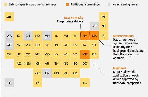 在马萨诸塞州和马里兰州,当地执法机构分别和Uber达成了州一级别的审查协议。2017年,马萨诸塞州对Uber和另一共享出行公司Lyft批准的17万份司机申请进行了审核,有2万份被拒绝,其中109个司机涉及性侵历史。