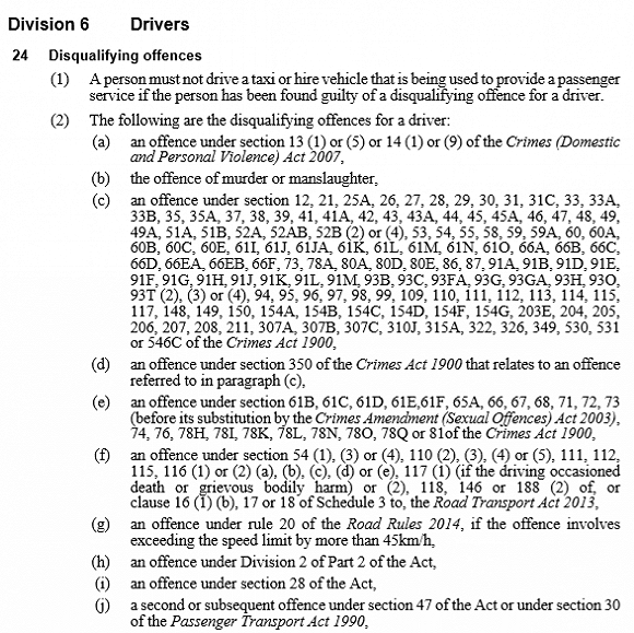 在各项规定中,悉尼所在的新南威尔士州对于司机身份的背景调查尤其严格。根据新州《2017年点对点交通法》(Point to Point Transport (Taxis and Hire Vehicles) Regulation 2017)第24条,不能通过背景调查的情况包括:曾有家暴、谋杀、人身伤害、性侵、严重交通事故至伤亡、中度或重度酒驾、严重超速、在驾照被暂停时违章上路、财产犯罪等记录的。
