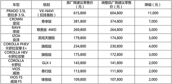 此次厂商建议零售价格下调后,一汽丰田车型价格最高降幅达11000元人民币。