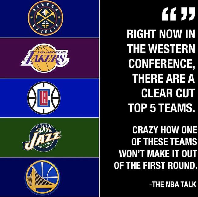 今天美媒《The NBA Talk》官方更晒出一张2019-20赛季西区5强预测图,从上到下分别为掘金、湖人、快船、爵士和勇士,排名不分先后。