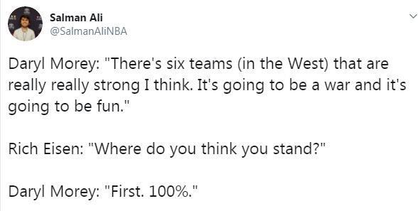莫雷分析了西部的冲冠形势:“我认为西部有6支球队非常强大,这将是一场战争,同时会很有趣。”主持人追问莫雷:“你觉得你们球队排第几?”