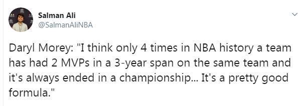 莫雷在节目中提到了双MVP夺冠的历史。“我认为NBA历史上只有4次出现3年之内的两位MVP聚集在同一支球队,最终都是得到了总冠军,这是非常好的案例。”莫雷表示。很显然,这是他敢说火箭100%西部第一的重要原因。