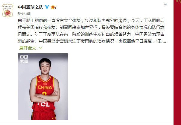 由于腿上的伤病一直没有完全恢复,经过和队内充分的沟通,今天,丁彦雨航启程去美国治疗和恢复。能否回来参加世界杯,最终要结合他的身体情况和队伍意见而定。对于丁彦雨航在前一阶段的训练中所付出的艰苦努力,中国男篮表示由衷的感谢。中国男篮会密切关注丁彦雨航的治疗情况,也祝福他早日康复,“王者归来”!