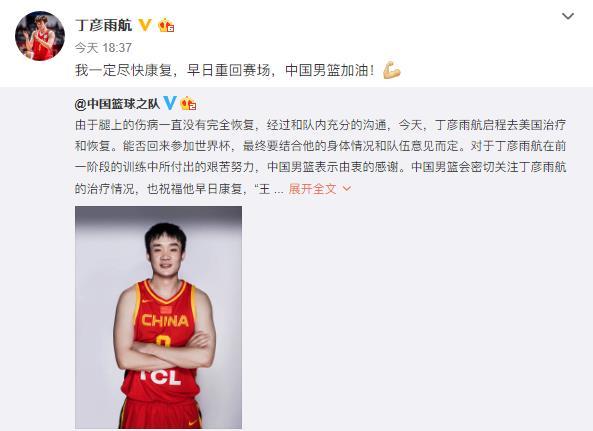 腾讯体育8月1日讯 中国男篮下午在官方社交媒体上通告,小丁将再次赴美治疗和恢复,能否参加篮球世界杯要看身体情况和球队意见而定。而就在男篮官方发声后,小丁也亲自回应,他表示一定尽快康复,早日重回赛场,并为中国男篮加油。