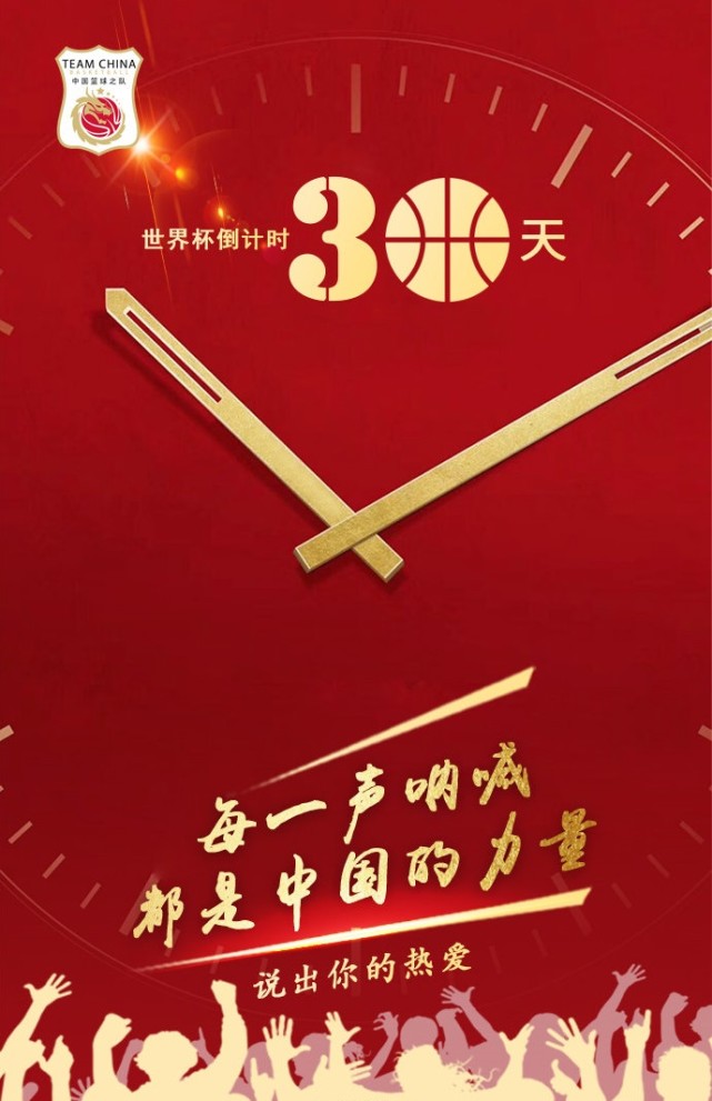 腾讯体育8月1日讯 在距离2019篮球世界杯开幕还有30天之际,中国男篮官微发布了一张“世界杯倒计时30天”的醒目海报,并配文:“每一声呐喊,都是中国的力量”。