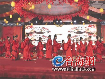 (驻福州记者 林芹 通讯员 林志宏 林静 实习生 倪琦 文/图)8月7日是中华民族传统的七夕节,在福州中庚喜来登酒店,来自海峡两岸30对新人满怀喜悦,在福州喜娘“好呀好吖”特有的喝彩声中,踏着汉乐鼓点登上华丽的汉婚舞台。60位两岸新人异口同声发出“死生契阔,与子成说,执子之手,与子偕老”,将集体婚礼推向高潮。