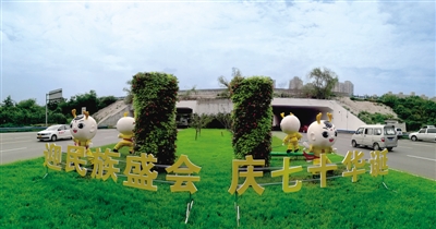 在连霍高速江山路出站口,绿地中新摆放了五颜六色的鲜花,还设置了“喜迎民族盛会”等宣传语,并增设了一处以两片树叶、两个骑自行车的运动员为造型的绿雕,展示出郑州热情好客的良好形象。