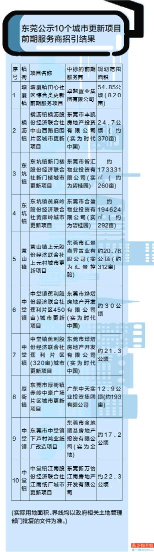 记者梳理公开资料发现,近两个月(5月31日-7月29日)以来,东莞市农村(社区)集体资产管理网公布了十余个城市更新项目,其中10个城市更新项目已确定前期服务商。而中标房企名单,既有碧桂园、时代、金地等房企大鳄,也有中天、汇景等本土房企的身影。不难看出,各大房企都在紧抓城市更新这个新机遇,转型升级进入下一个发展阶段。
