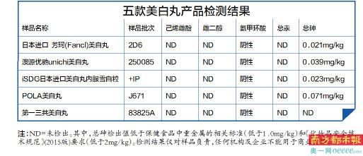 杨潞芳介绍,由于美白丸产品在国内没有直接对应的产品标准,此次检测只能参考中国食品及保健食品的相关测试方法来进行测试。