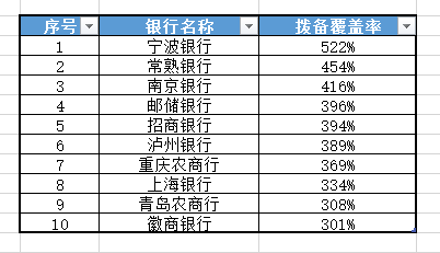 以2019年半年报数据来看,在A股和港股上市的50家中资银行中,共有10家拨备覆盖率超过300%,其中宁波银行较高,拨备覆盖率为522%;常熟银行次之,为454%;南京银行第三,为416%。