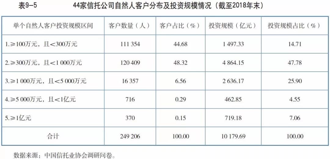 根据44家信托公司的有效样本数据,截至2018年末,44家信托公司有信托产品余额的自然人客户存量约为24.92万人,投资规模合计约1.02万亿元。投资规模在1000万元以下的自然人客户数约为23.18万人,占比93%,贡献的投资规模占比62.49%,说明国内绝大多数自然人客户的信托投资规模集中在1000万元以下,信托公司客户的投资潜力有待进一步挖掘。投资规模超过5000万元的超高净值自然人客户数量为1086人,占比0.44%,贡献了11.61%的投资规模。投资规模在5000万元以上的超高净值客户数量较为有限,这反映了信托公司在拓展客户方面仍有较大的进步空间,应积极提升综合金融服务能力,有效吸引这部分超高净值客户。