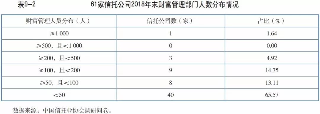 根据行业调研情况,截至2018年末,已有59家信托公司专设财富管理部门,其中25家信托公司又下设了二级部门,如营销管理部、客户服务部和区域财富中心等。相比较而言,财富管理部门设置较为完备的信托公司有外贸信托和上海信托等,在一级财富管理部门下面分设客户服务部、营销管理部、私人财富部、机构财富部、家族财富部、财富产品部、投资管理部等二级部门,上海信托甚至还另外设置了国际理财部和互联网理财部等。整体而言,目前已主动发展财富管理业务的信托公司仍以服务信托产品销售为中心,通过不断铺设区域财富中心网点、加强营销管理和客户服务等提升信托产品营销能力。