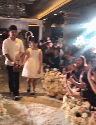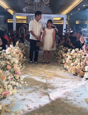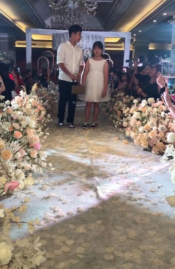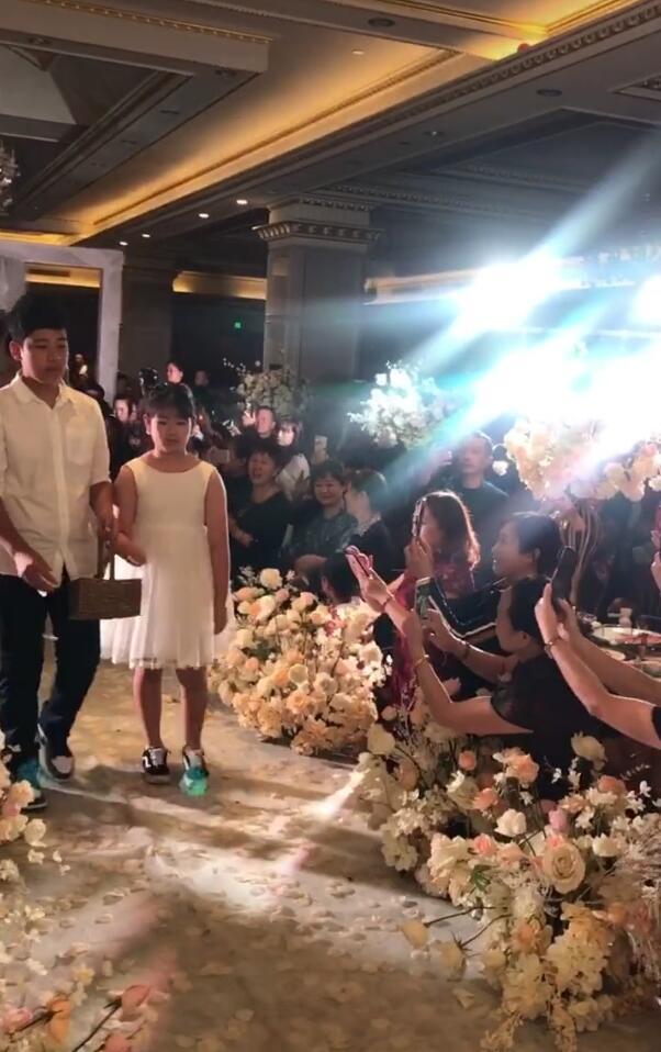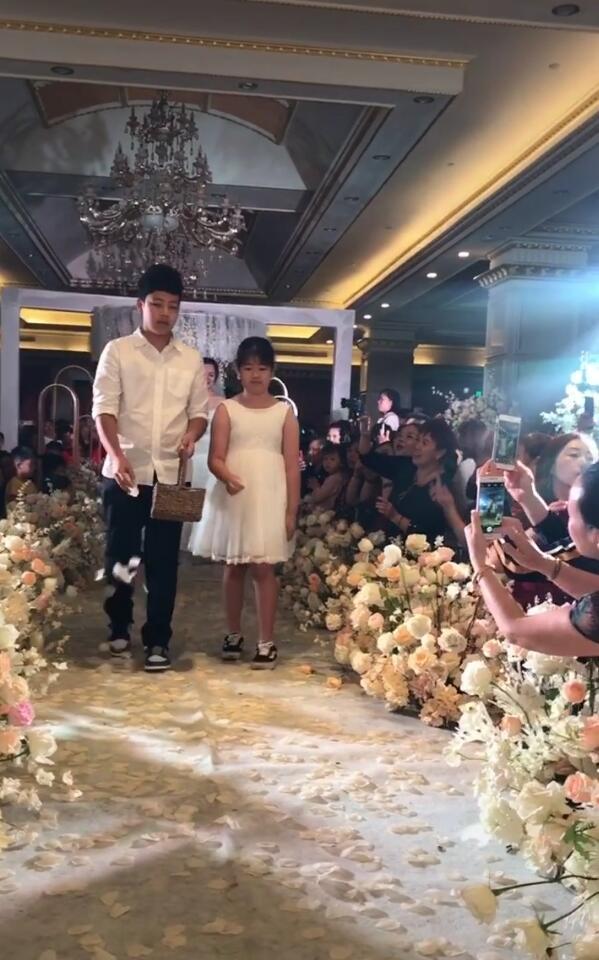 小石头跟妹妹都是肉嘟嘟的身材,妹妹穿着白裙子是挺可爱的,但两兄妹在台上似乎一点都不开心,哥哥提着花篮,妹妹一脸不情愿拿出几片花瓣,别的小花童都是非常开心,把花瓣撒得很高,但小石头兄妹二人,两人跟没吃饱一样,非常敷衍的撒了几下,一旁拿出手机拍照的阿姨们,更多的都是关注这两个星二代,都没几个去拍新人的了。