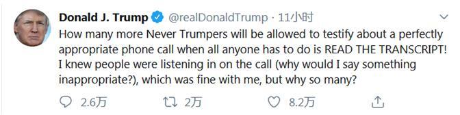 其中一条推文表达出的情绪十分不满,“当所有人需要做的仅是去读读那份通话文字记录的时候,还要有多少‘特朗普黑’(Never Trumpers)来对一则本就完全恰当的通话作证!我知道有人在偷听我的电话(我怎么可能说不恰当的话呢?),”他继续问道,“可咋就能有这么多人?”