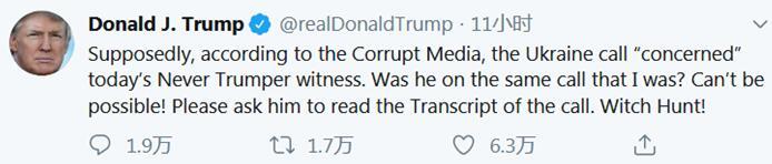 接下来的推文中,特朗普还质疑举证之人偷听的是否就是他跟乌克兰总统泽连斯基的那则通话,“他听的是我(跟泽林斯基的)那次通话吗?不可能!请让他去看看通话记录。(真是)猎巫行动!”