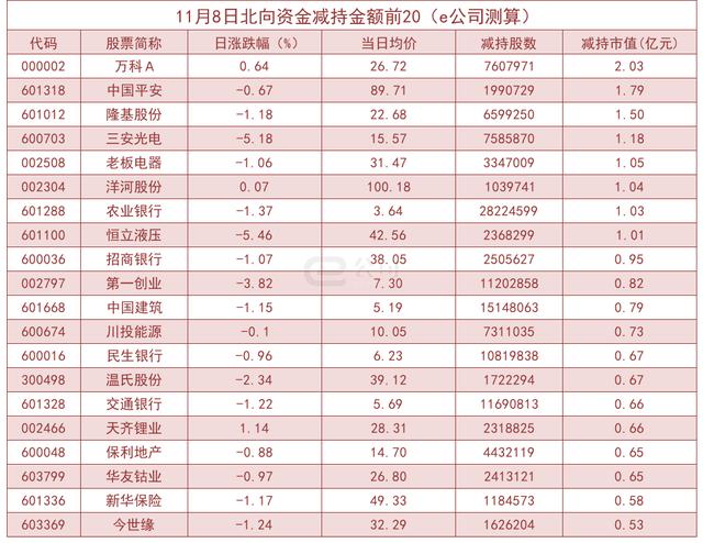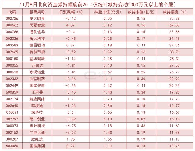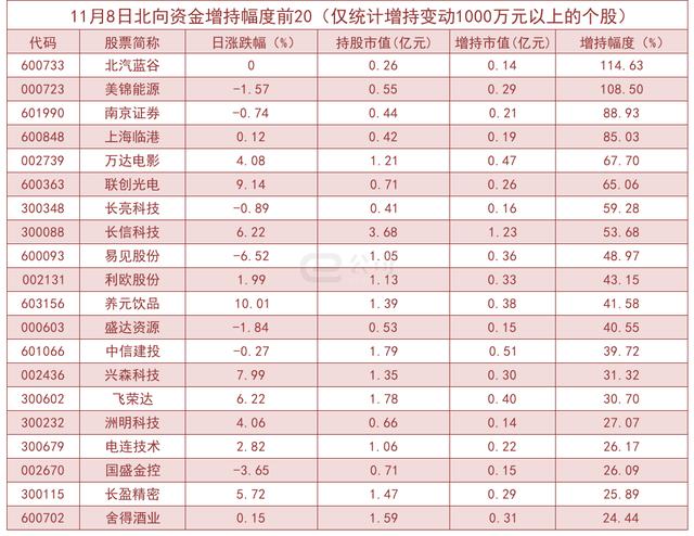 据e公司测算,增减持变动1000万元以上的个股中,北汽蓝谷、美锦能源、南京证券、上海临港等获北向资金大幅增持,分别为114.63%、108.50%、88.93%、85.03%。而龙大肉食、天夏智慧、通化金马、永太科技等减持幅度较大,分别减持75.38%、59.89%、53.88%、39.46%。